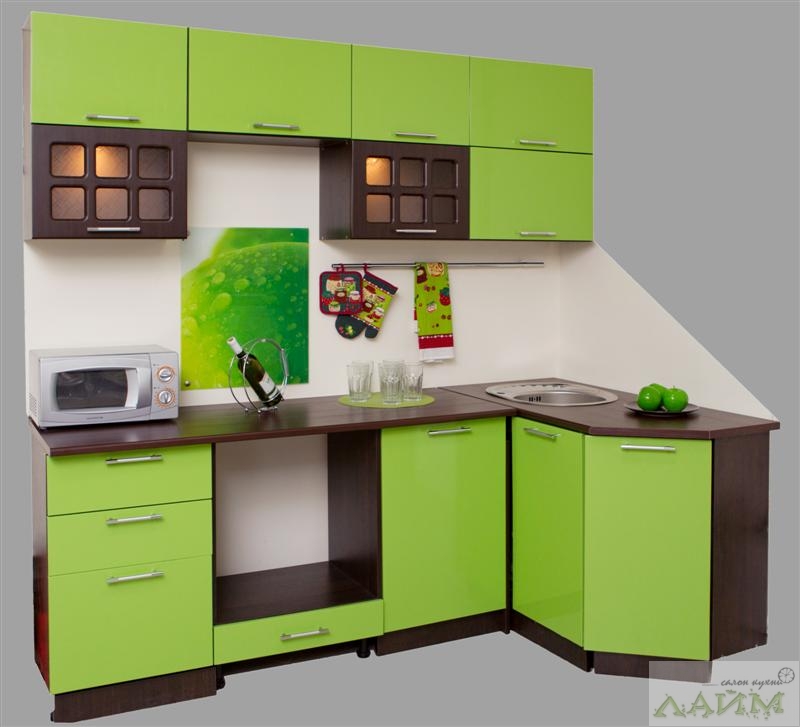 Кухонный гарнитур студия Лайм. Эффектные фасады салатового цвета. В каталоге компании имеется более 60 цветов фасадов и более 100 модулей, что позволяет создать кухню с учетом всех пожеланий и особенностей интерьера. Модуль может быть нестандартным по высоте, ширине и глубине. В качестве фасадных материалов используются МДФ в пленке ПВХ, ЛДСП и массив сосны. Рабочая поверхность – постформинг. Комплектация фурнитуры производится по желанию заказчика. Широкий модельный ряд моек из саянского мрамора «Granicom», устойчивых к бытовым повреждениям, загрезнениям и агрессивным средам. Наши дизайнеры выполнят индивидуальный проект и определят стоимость предложенного варианта.