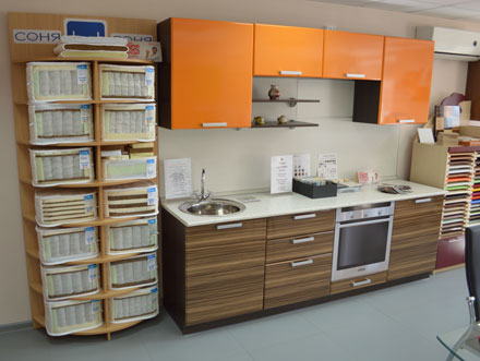 Фасады МДФ в пленке ПВХ верх оранжевый глянец, низ зебрано глянец, столешница постформинг.